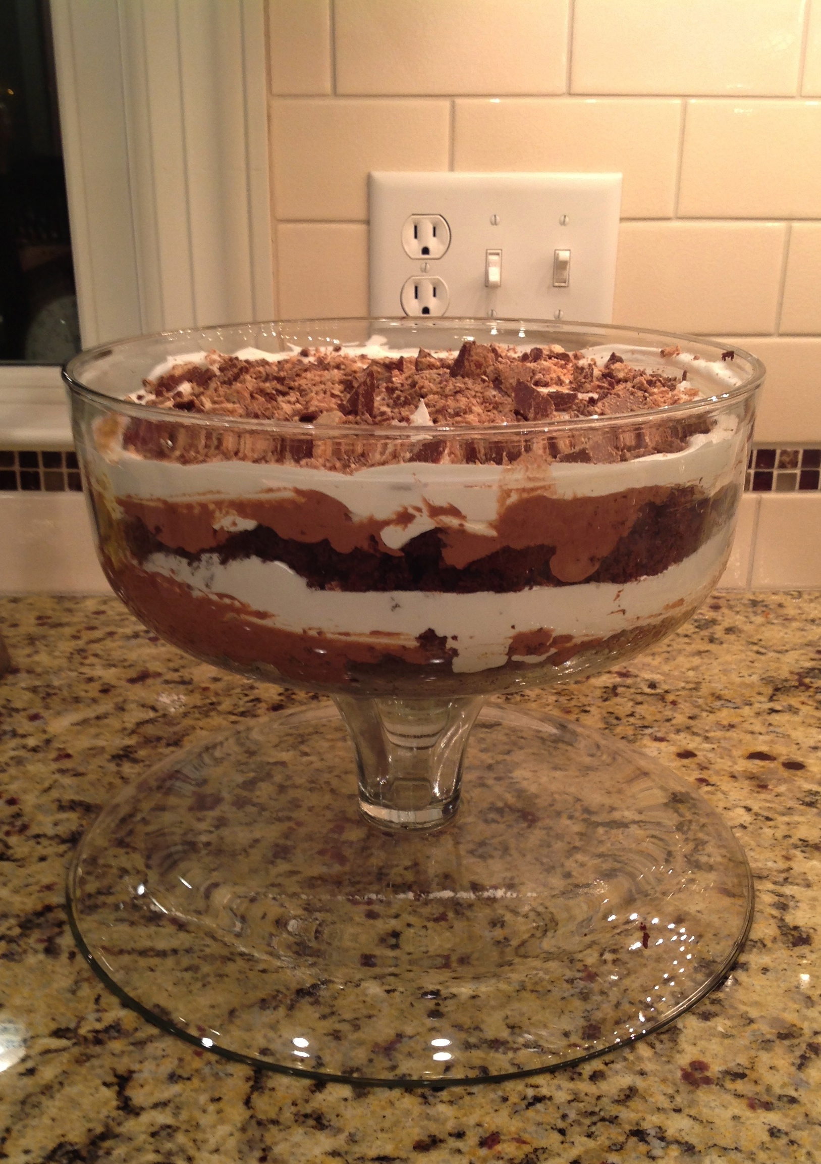 Here is a recipe that my Mom always made for special occasions when we were kids….I especially remember it on New Year’s Eve!  Her recipe was a little different because she used Heath Bars……and with all the nut allergies nowadays I stick with Kit Kats.  She also used to put Kahlua in her cake mix to give it a little extra kick, I do not.  You definitely can add the Kahlua and swap the Heath for the Kit Kats! But no matter how you do it…..you will be sure to have a crowd pleasing dessert!!!  It’s a very simple recipe, that really takes no time at all…..As long as you have the ingredients in your kitchen. You can make it for a large crowd, for a holiday, for a BBQ, or just for 2 people to share on Valentine’s Day (and the week following with leftovers).  I made this for New Year’s Eve and even though a lot of it went…I was so excited to have leftovers!!!!   It’s even better after it sits in the fridge for a few days!   YUM!!!!
