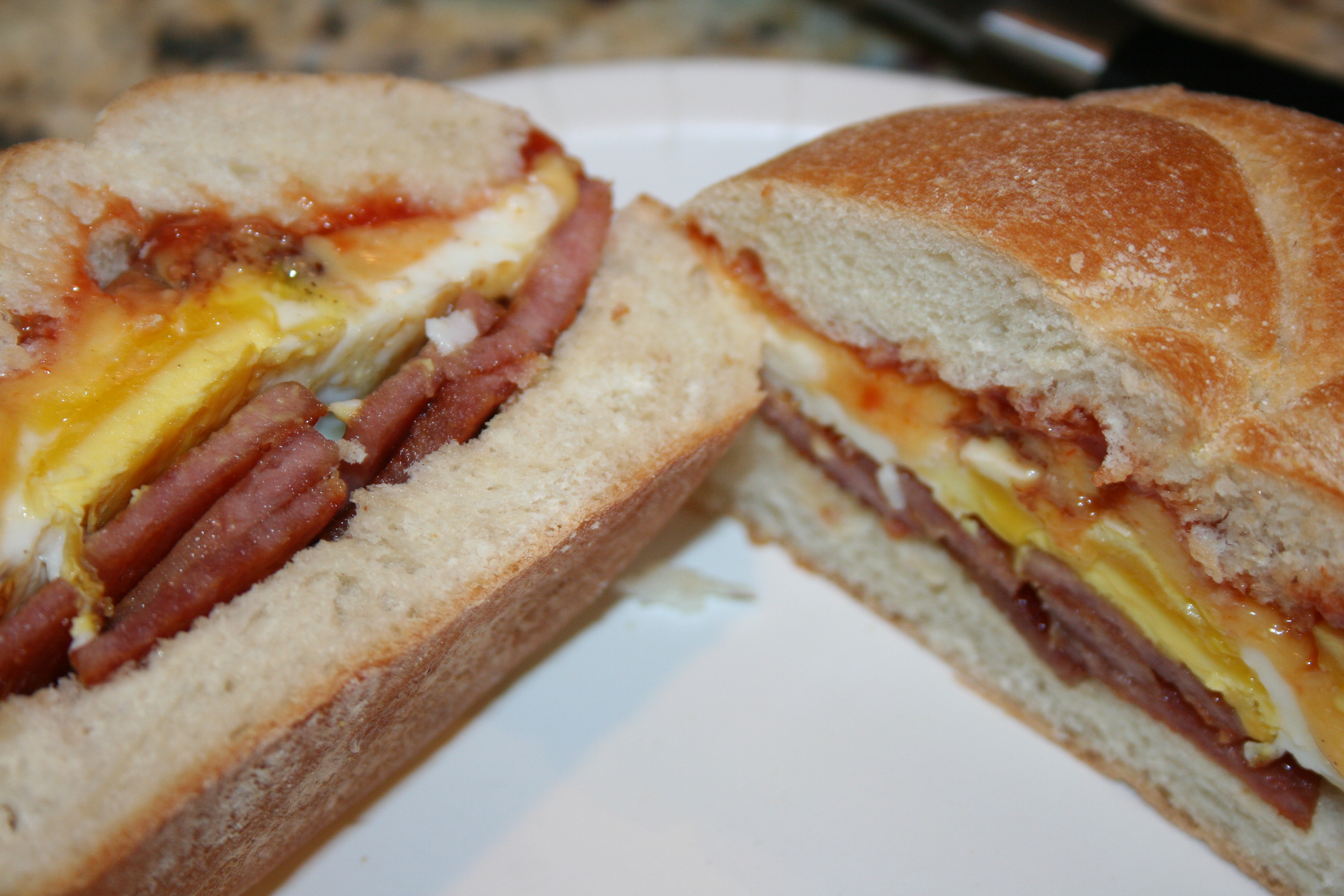 Next you simply layer it all on top of a hard roll, a bagel, a croissant..I prefer mine on a hard roll and add some salt, pepper and ketchup (SPK). When you order one of these sandwiches in NJ…..they will always ask “saltpepperketchup?” 3 words, mumbled into 1, but that any New Jerseyian understands.