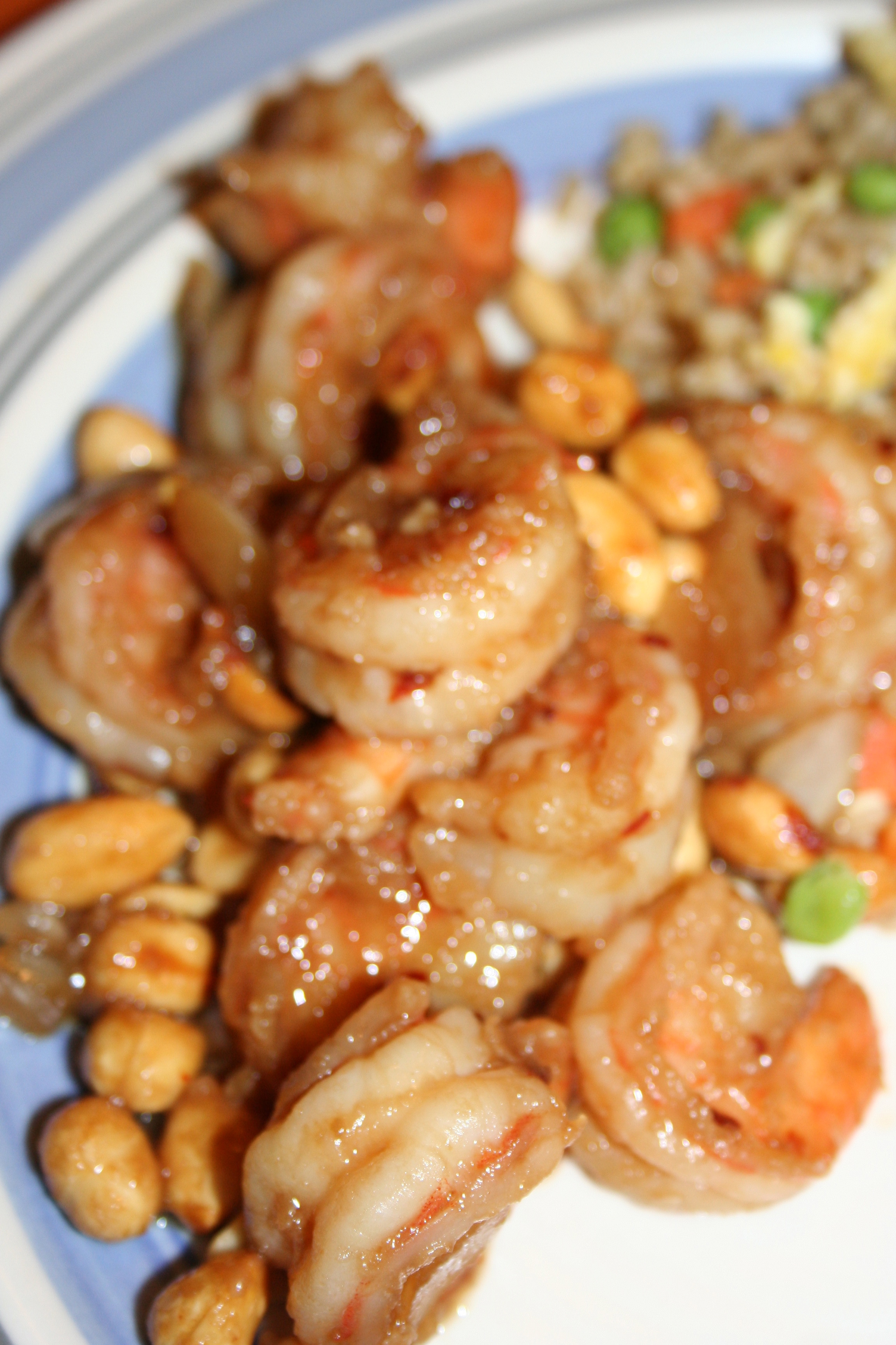 Return shrimp to the wok and coat with sauce. Stir in roasted peanuts. Heat thoroughly.  Place over white or fried rice.